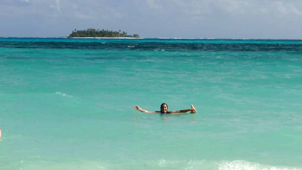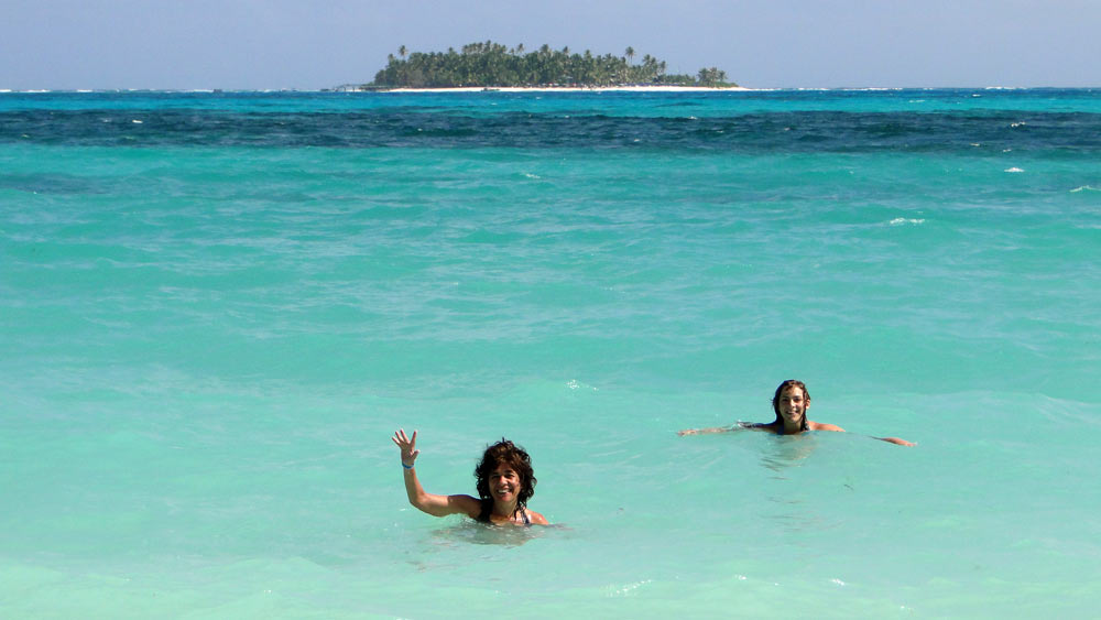 Nora y Diana en el agua. Al fondo, el Jhonny Cay
