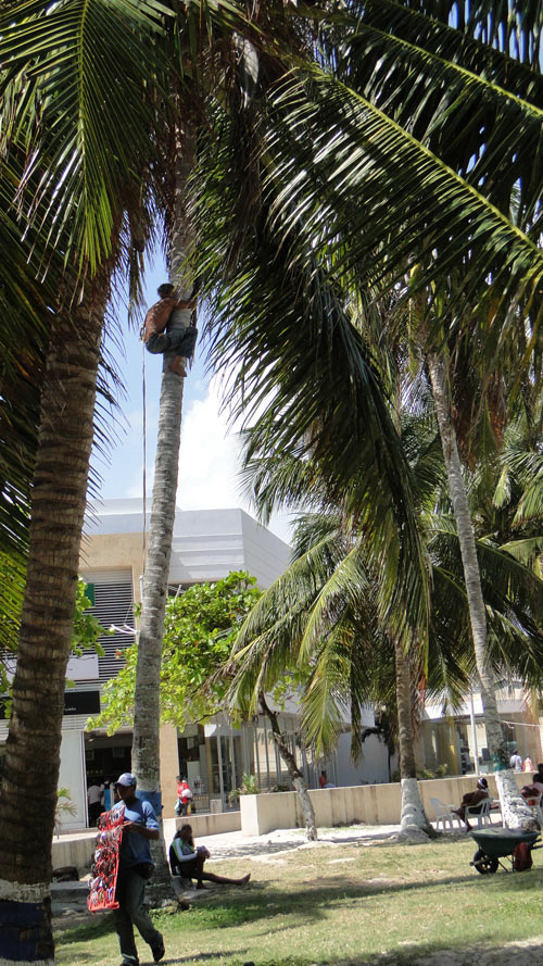 En la zona de palmeras, detrás del puesto de la cooperativa de lancheros, un hombre se trepa a una palmera para cortar cocos