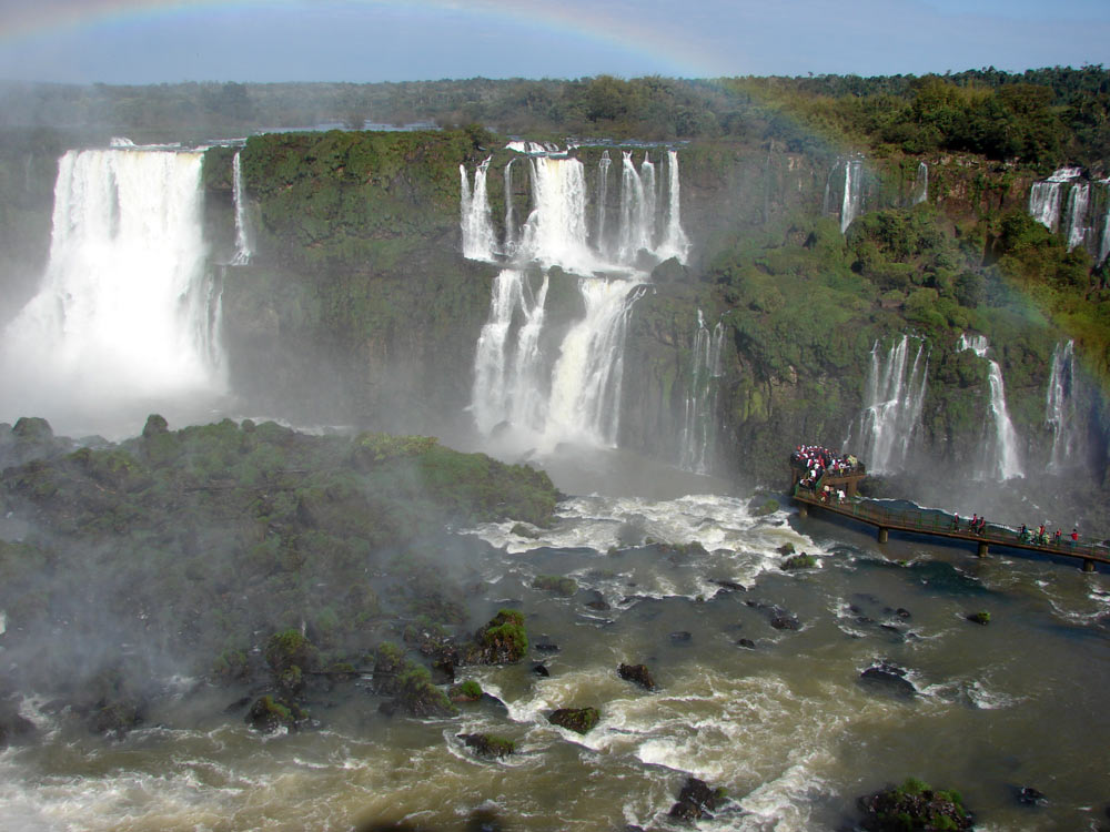 Las pasarelas del mirador brasilero. Al fondo el salto Floriano