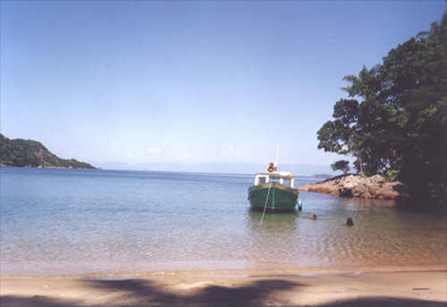 Otra de las playas de la Freguesía de Santa Ana. Ese barquito verde es el Subaru, el "yate" en el que salíamos a recorrer playas y "mergulhos", todos los días, a partir de las 9 de la mañana.