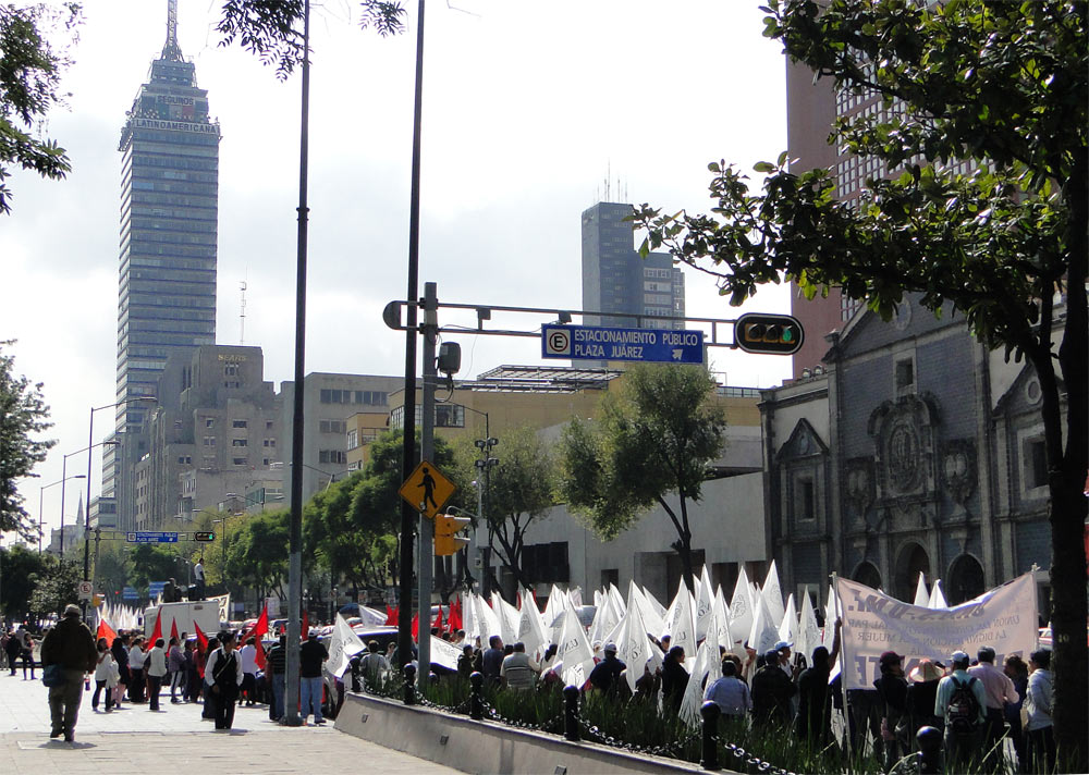 Manifestación por la Av. Juárez (bordea la Alameda Central). Al fondo la Torre Latinoamericana