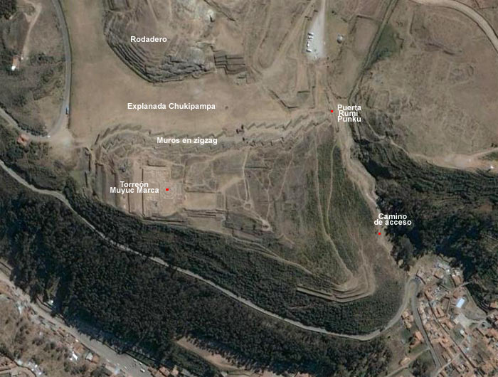 Vista aérea de Google Earth de la ciudad de Cusco y las ruinas