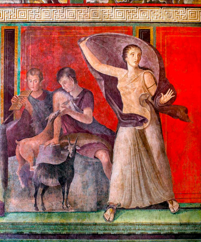 La mujer que aárece aterrorizada o en estado de shock, podría estar reaccionando a la revelación de un falo, símbolo de la fertilidad, o a un látigo, parte de una flagelación ritual.