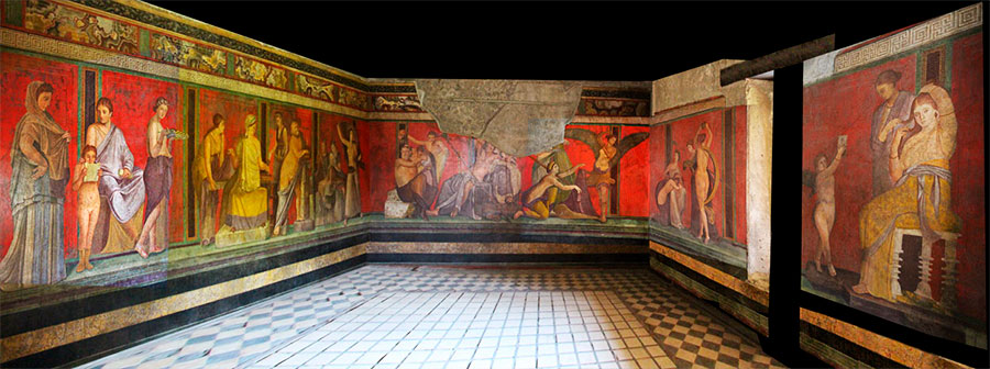 La “villa de los misterios” es una gran residencia, en Pompeya (Italia) convertida en granja, y toma su nombre de un fresco de 17 metros de largo que se encuentra en las cuatro paredes del triclinio, el comedor de la casa.