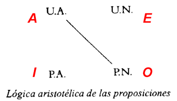Para ello va a utilizar el conjunto de relaciones proposicionales que encontramos en Aristóteles bajo la denominación de "cuadrado de Apuleyo", no porque lo haya inventado Apuleyo, sino porque este es uno de los primeros difusores de los trabajos de Aristóteles. La organización de las proposiciones en ese cuadrado es en términos de cantidad (universales y particulares) y de negación (afirmativas y negativas).