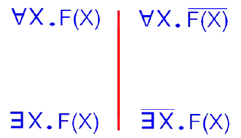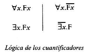 En la universal afirmativa tenemos “todo x verifica Φx”, en la universal negativa tenemos que “ningún x (no existe x que) no verifica Φx”, en la particular afirmativa tenemos que “algunos x (existe x que) no verifican Φx” y en la particular negativa “algunos (no todos) x verifican Φx”