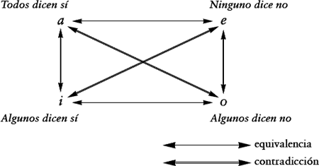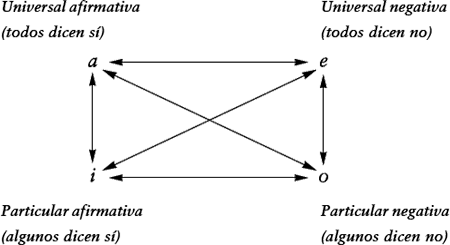 Este cuadrado permite precisar las relaciones lógicas entre esas proposiciones: contradicción, contrariedad, equivalencia, etc.Recordemos el cuadrado con las cuatro proposiciones, habitualmente indicadas con las letras A (universal afirmativa), E (universal negativa), I (particular afirmativa) y O (particular negativa