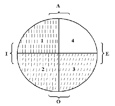En dicho cuadrante, Peirce señala que las universales afirmativa y negativa comparten un sector, el que no tiene trazos.