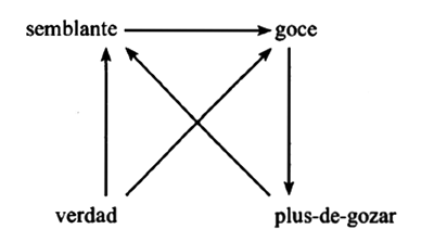 De esta manera, el número y orientación de estos vectores permiten distinguir los cuatro polos que Lacan enuncia con los términos verdad, semblante, goce y plus de goce.El carácter topológico de esta construcción consiste en las relaciones (vectores) establecidas entre esos polos (vértices).