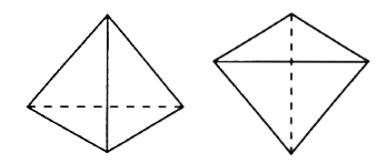 Volviendo al tetraedro, puede considerarse como una superficie bilateral homeomorfa a la esfera. Pero Lacan no hace un tratamiento del mismo como superficie sujeta a transformaciones o cortes, como hizo con el cross-cap o la banda de Moebius. Lo que va a destacar del tetraedro es su variante “regular”, donde se realiza la limitación de que “colocar cuatro puntos a igual distancia es lo máximo que ustedes pueden hacer en nuestro espacio” (64) . En efecto, el agregado de cualquier vértice extra haría que fuese coplanar (8). Esta regla matemática quizás sea más fácil de entender si lo pensamos en el plano bidimensional, donde solo se pueden distribuir tres puntos a igual distancia, formando un triángulo equilátero, y donde es intuitivo percibir que no habrá manera de ubicar un cuarto punto de modo que se mantenga la equidistancia entre sí (ya que estarán forzados a estar sobre una misma línea).