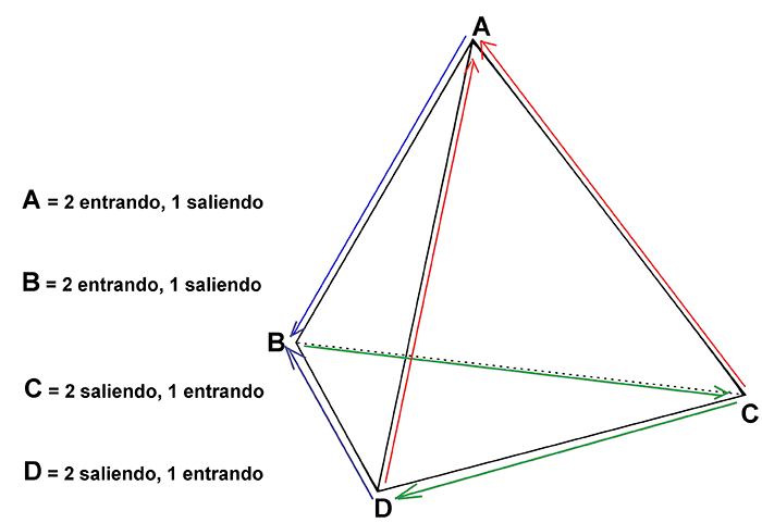 La primera operación que realiza es la vectorización de sus aristas, es decir, asignarles un sentido. La segunda operación es definir que en ninguno de los vértices se admitan solo convergencias o solo divergencias de los vectores correspondientes. El resultado de esta operación es la siguiente repartición de vectores por vértice: resultarán dos vértices con 2 entrantes y 1 saliente, y otros dos vértices con 1 vector saliente y dos entrantes